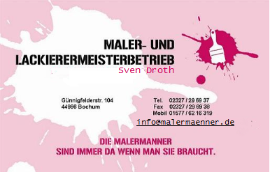 Firma: Maler- und Lackierermeisterbetrieb Sven Droth Günnigfelderstr.104 44866 Bochum. Kto. 431098, Blz. 43050001, Sparkasse Bochum, Steuer-nr. 350/5048/1382